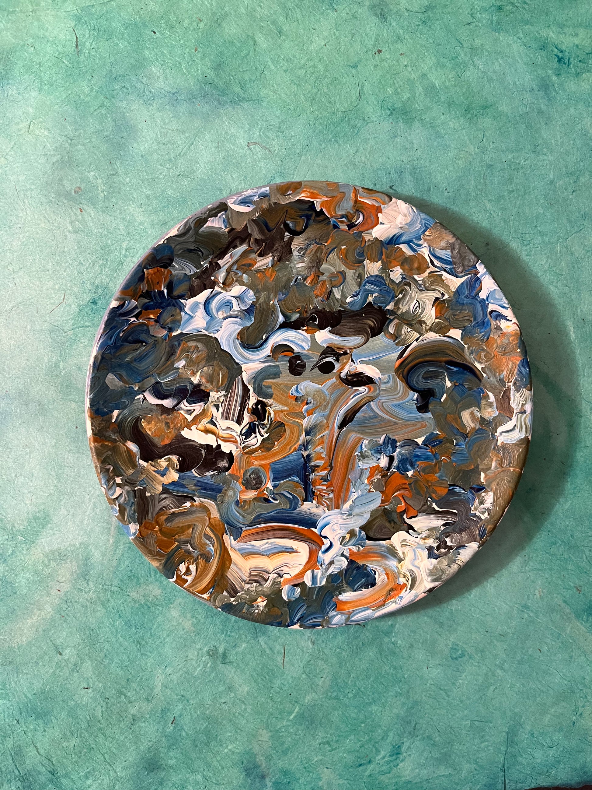 Acrylic paint on ceramic plate, 5.5" in radius.