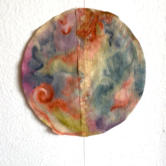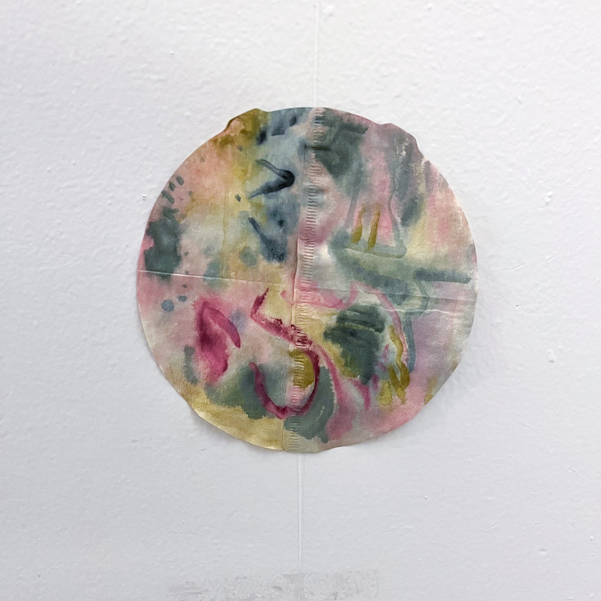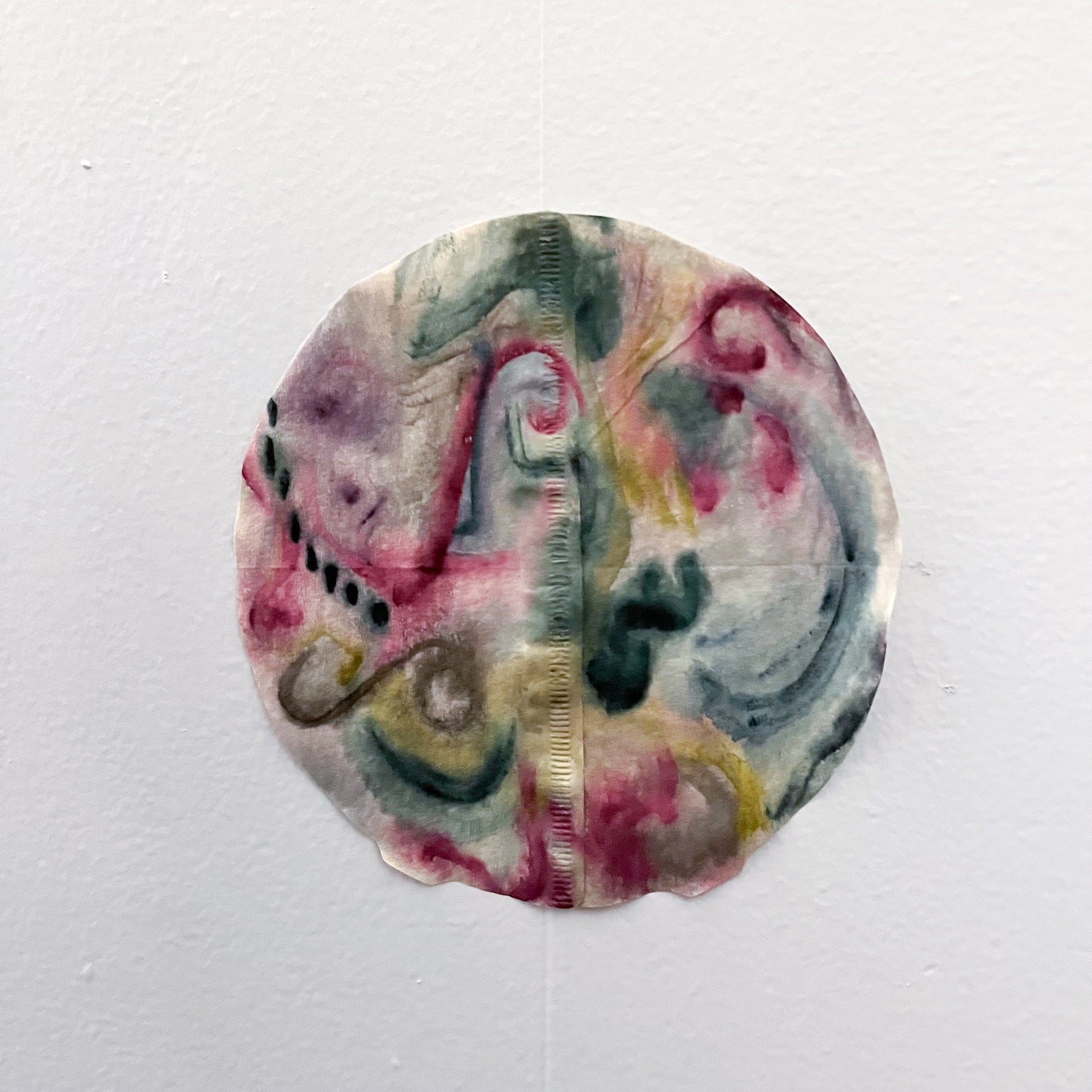 Japanese calligraphy watercolor on connected coffee filters, connected by a fishing line.