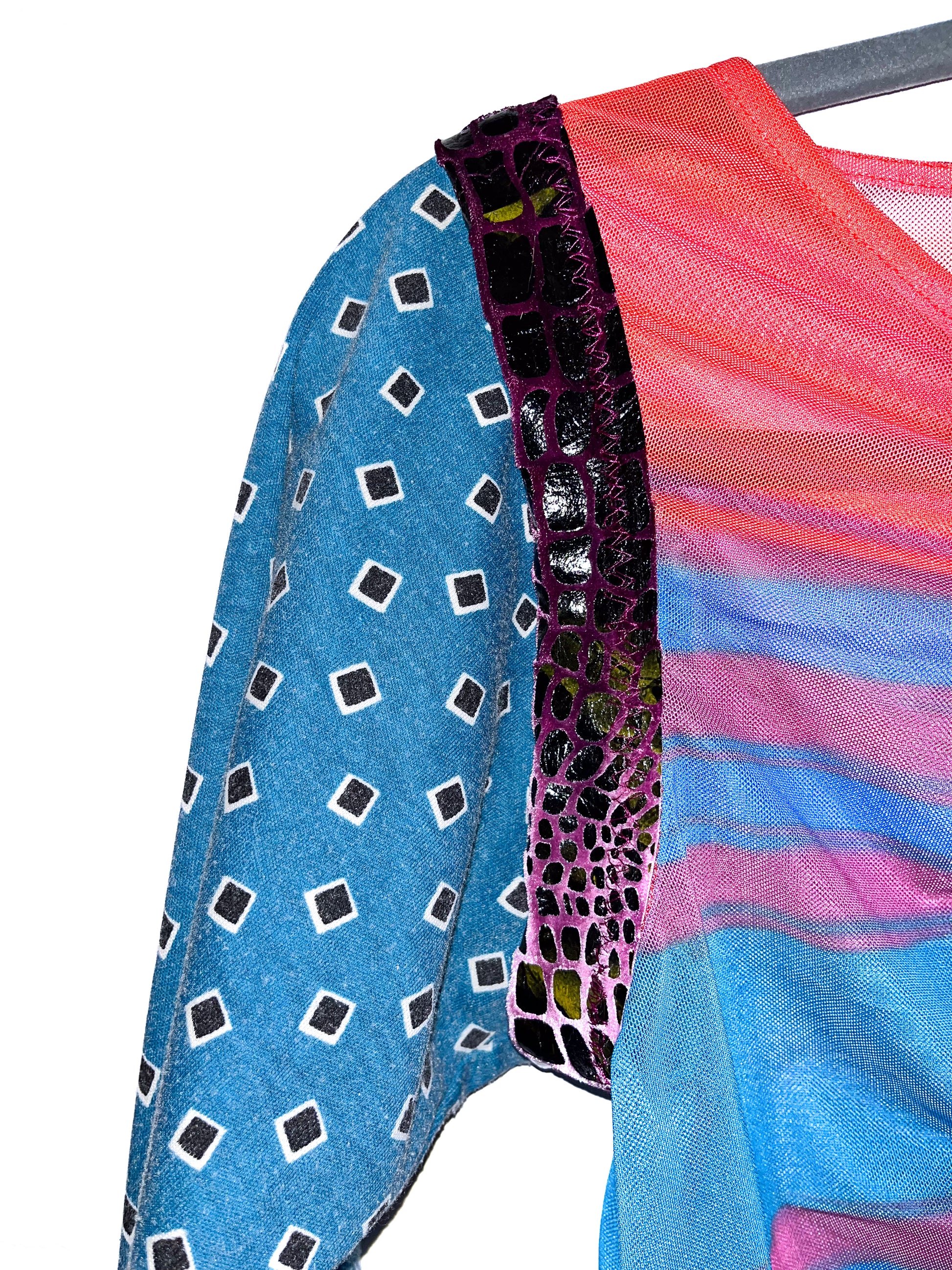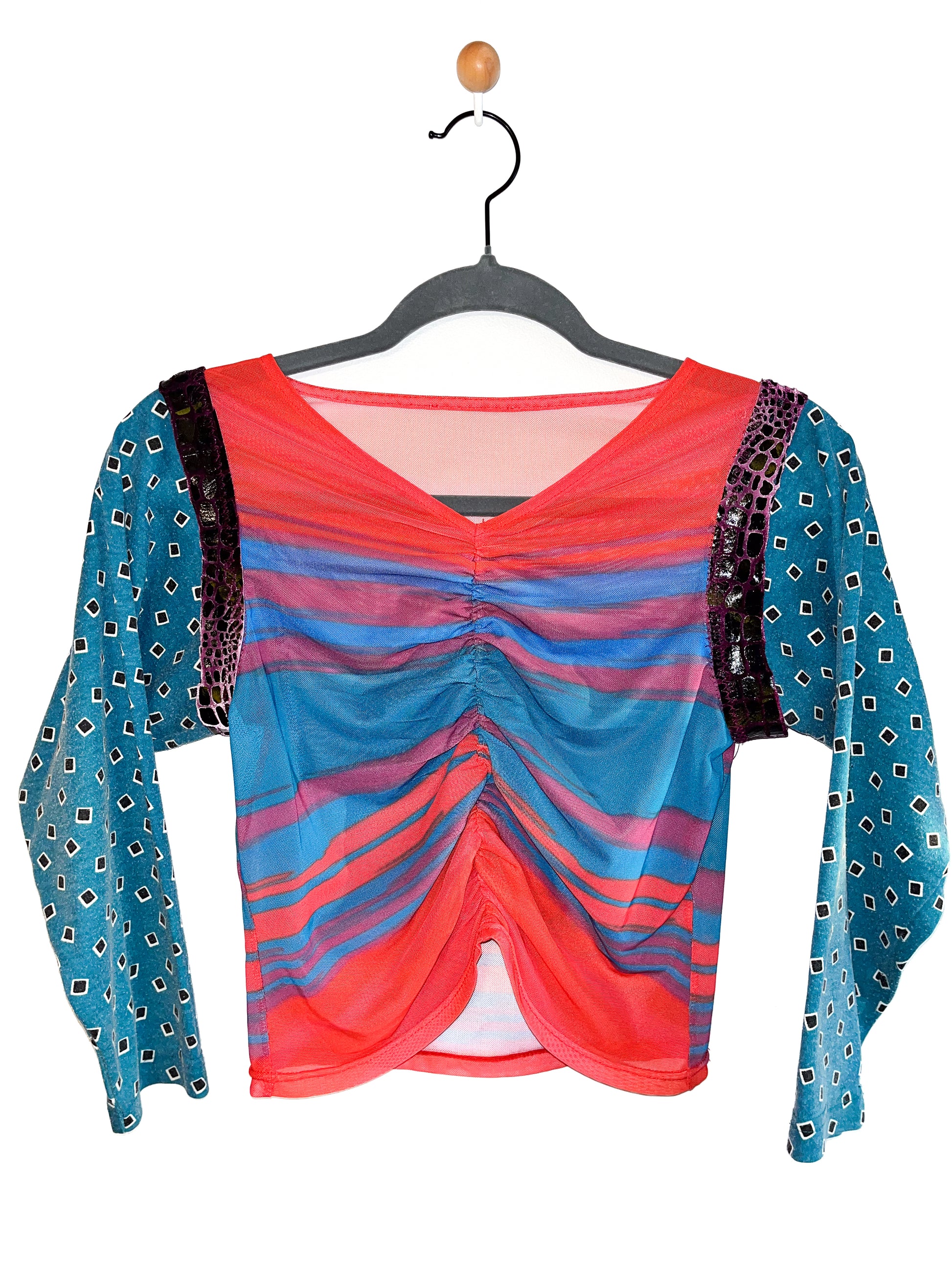 Upcycled top made of mesh, faux snakeskin, cotton. Size small.
